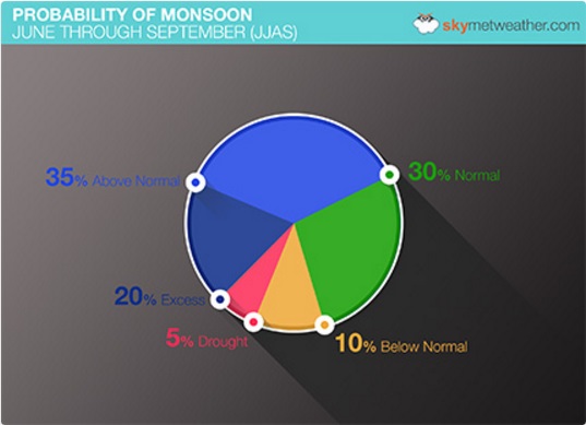 -- A 30% chance of a "normal monsoon" which is 96% to 104% of LPA and only a 10% and 5% chance of "below normal" (90-95% of LPA) or a "drought" (90% of LPA).